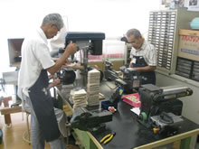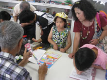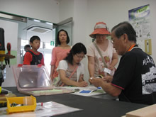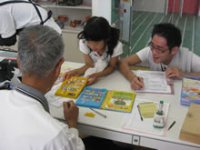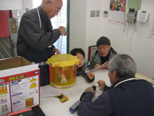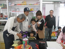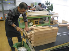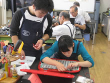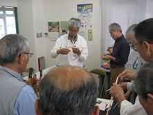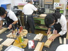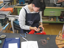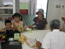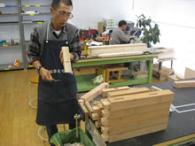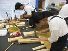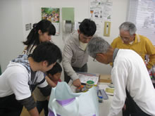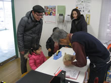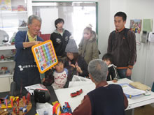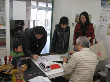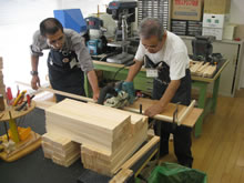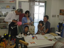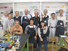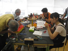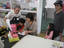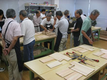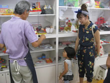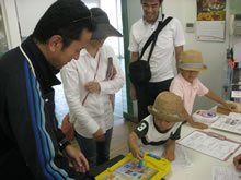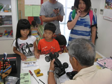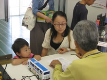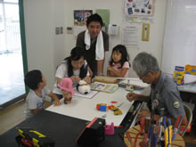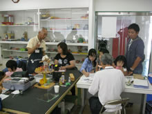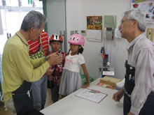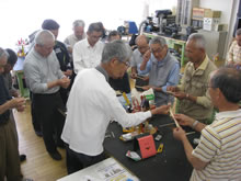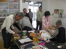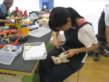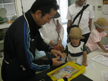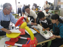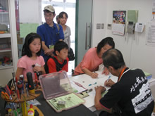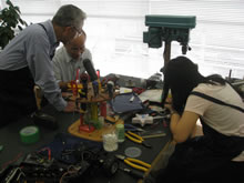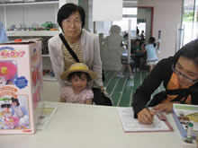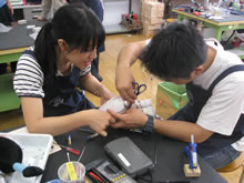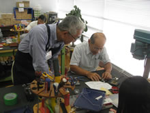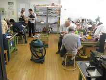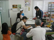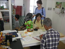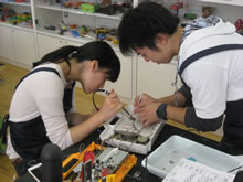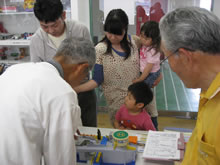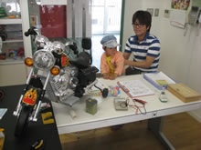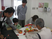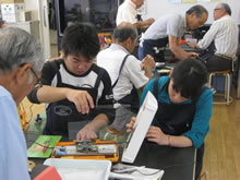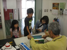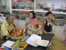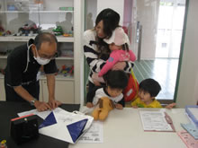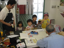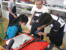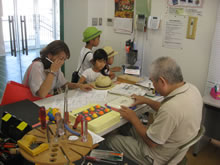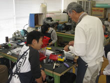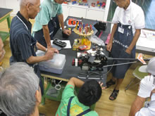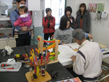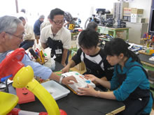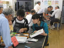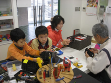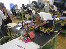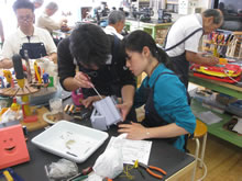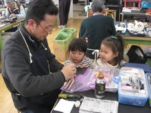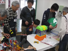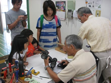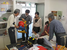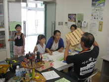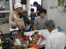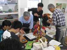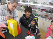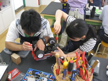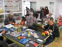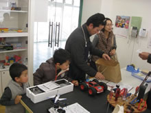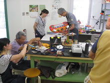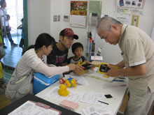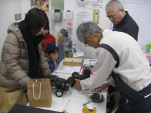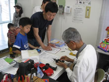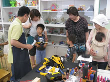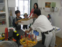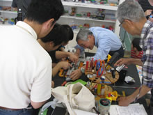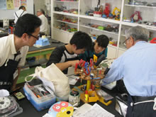 | 豊田高専の伊藤さんがラジコンの車修理中 | 夏休み親子工作教室の材料を加工中 | 直してくれたおもちゃを取りに来ました |