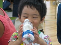 完成したペットボトル万華鏡を持って笑顔の参加者 |