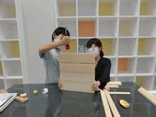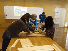 | バージョンアップした新型折りたたみテーブルを完成させて笑顔の参加者 | ||
