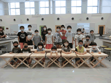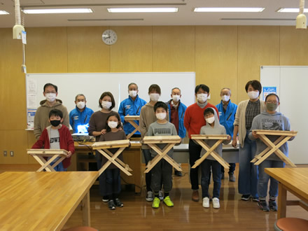 | バージョンアップした新型折りたたみテーブルを完成させ参加者の記念写真 | ||