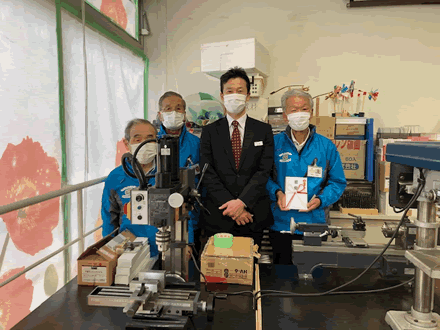 | 2021年3月4日(木)に三菱UFJ銀行刈谷支店の上田武司支店長様と吉田課長様が刈谷おもちゃ病院にご来院され、おもちゃ病院の長年購入がが夢でありました「精密卓上フライス盤」と付属器具の贈呈式が行われました。刈谷おもちゃ病院のボランティアドクター一同心から感謝しています。ありがとうございました。 | ||