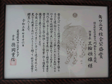 7月16日(金)に名古屋マリオットアソシアにおいて、第52回キワニス社会公益賞の授与式があり、刈谷おもちゃ病院が県下2団体の一つとして、名誉ある受賞を受けました。刈谷おもちゃ病院を代表して三輪理事長が授賞式に参加しました。 |